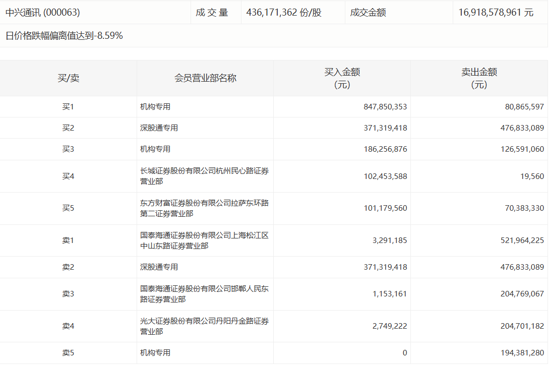 人民財(cái)訊12月11日電,中興通訊12月11日跌停,成交額169.19億元。盤后龍虎榜數(shù)據(jù)顯示,深股通專用席位買入3.71億元并賣出4.77億元,2家機(jī)構(gòu)專用席位凈買入8.27億元,1家機(jī)構(gòu)專用席位凈賣出1.94億元。